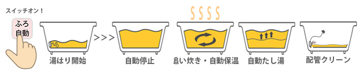 設定湯量より3~4cm水位が下がると自動的にたし湯を行い、湯量をキープします。入浴後浴槽のお湯を抜く際に、きれいなお湯で追い焚き配管内を自動洗浄します。 |