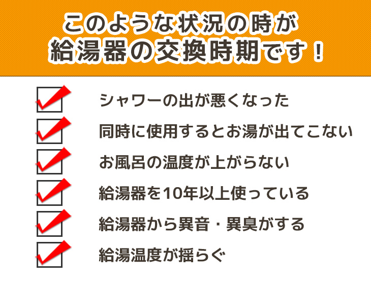 上記の項目に全てチェックが付く状況は、給湯器の修理・交換が必要な場合が多いです。