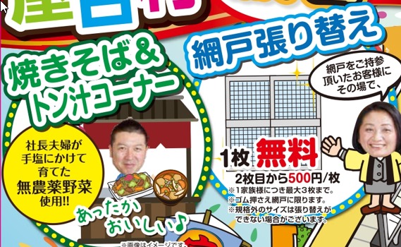 ご予約して来場いただいた皆様のために、JCBギフトカード1000円分や網戸を持参いただいたお客様にその場で網戸張替えサービス!テイクアウトOKの焼きそば豚汁コーナーあり!