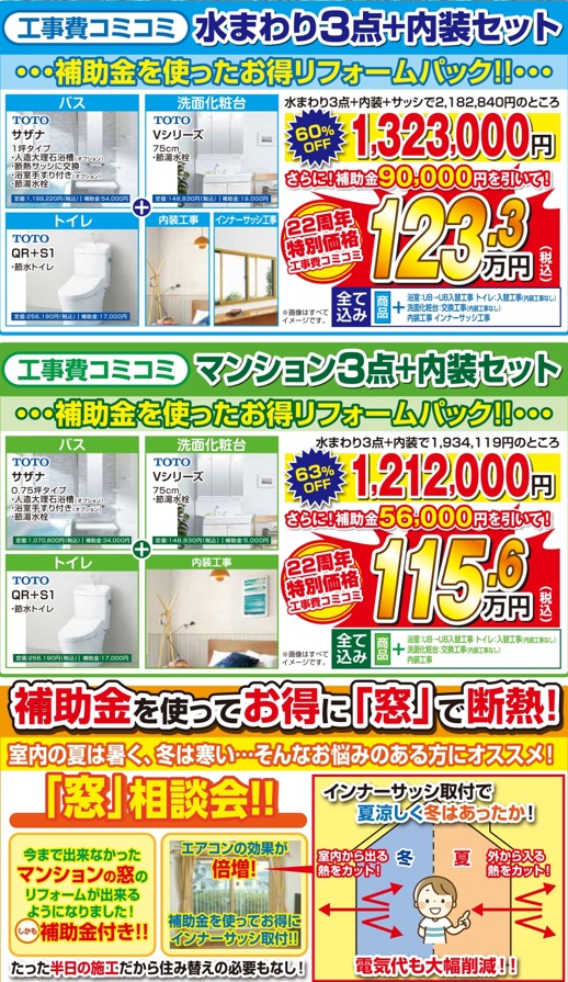 ご要望が多い水回り・マンション・内装・窓リフォームをお得なパッケージにしました!今なら補助金活用でとってもお得にリフォームしていただけます!詳しくはご来店時に話をしていただくか、ページをご用意していますので詳しくはそちらをご覧ください!
