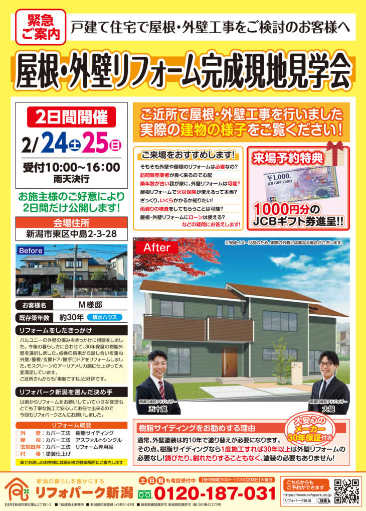 (会場:屋根・外壁リフォーム完成現地見学会) 詳しくはこちら >