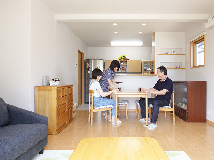 | ご提案内容 | 結婚して25年、1階はご主人のご両親が住まわれており、2階は若夫婦が住まわれておりました。奥様は仕事から帰ると2階の寝室と8帖の居間が唯一の居場所でした。今まで何度かリフォームをしたものの、大工だったお父さんが自分で修繕したりお父さん主導のもと行われていたので、ご夫婦がリフォームに口を出すことが許されませんでした。そんな状況の中で、自分たち主導でリフォームしたいという想いが強くなり、ご両親にも賛同してもらうことができ全面改装リフォームをする事になりました。 |