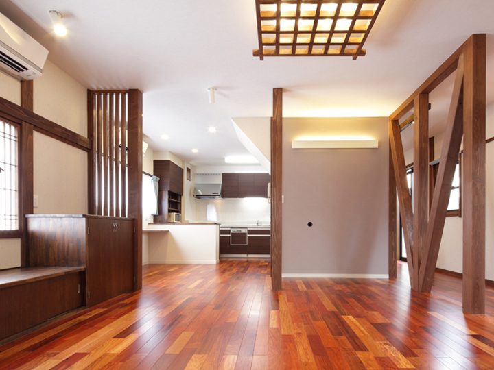 | ご提案内容 | 当社のホームページをご覧になり、いくつかの施工事例の中から、お客様のイメージにあった施工事例があり、ご来店いただきました。 機能的な設備機器を取り入れながらも古民家調のイメージを出したいとうご希望だったので、重厚感のある古民家調の仕上がりになりました。 また、広い空間を確保しながらも耐震性を考慮しました。 |