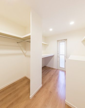 6帖のウォークインクローゼットは、洋服や布団、衣装ケースまで入ります。大容量です。裏へ出ることができる勝手口も取り付けました。